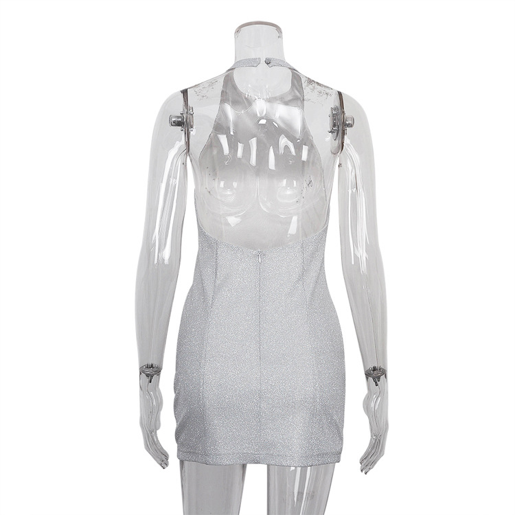 Este vestido halter de lantejoulas é a definição de elegância sexy e ousadia. Feito com poliéster de alta qualidade, ele oferece o brilho sutil das lantejoulas e glitter, trazendo sofisticação instantânea a qualquer look. A modelagem sem mangas e o design sem costas deixam sua silhueta deslumbrante, criando uma combinação de sensualidade e classe. A cintura média acentua suas curvas de maneira elegante, e a saia curta garante um visual poderoso e feminino.